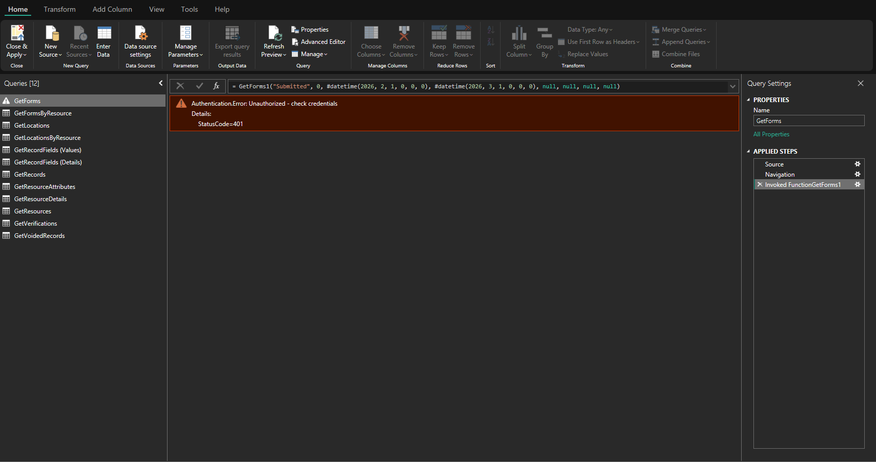 Q: On the Transform Window, I see an error that says "Authentication.Error: Unauthorized"