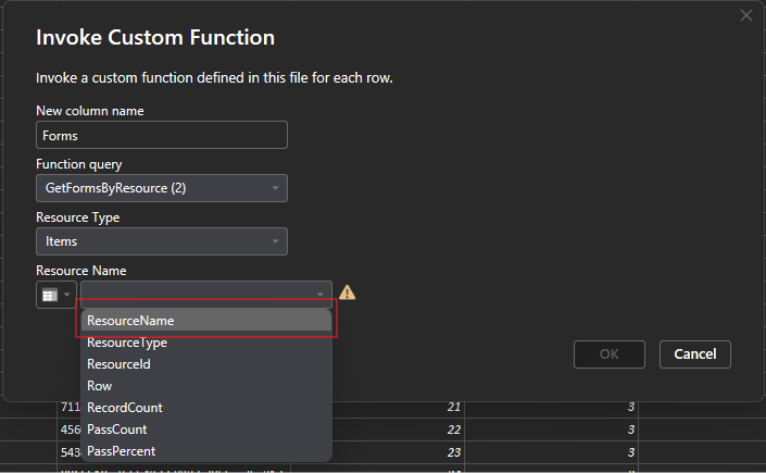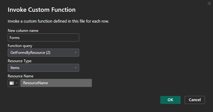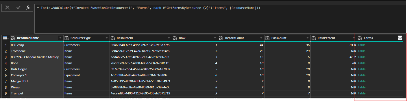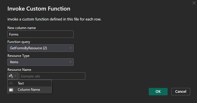 - Enter in "Forms" for the New column name, select the Function query GetFormsByResources, Select a Resource Type, and under Resource Name, change the value from **Text **to Column Name.