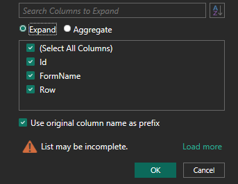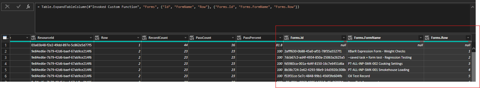 - Expand the records in the Forms column into new rows by clicking the expand icon (the double-headed arrow) in the column header of the Forms column.