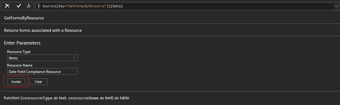 Note:You can fill out the function parameters and click _Invoke _to create the table automatically. See example below.
