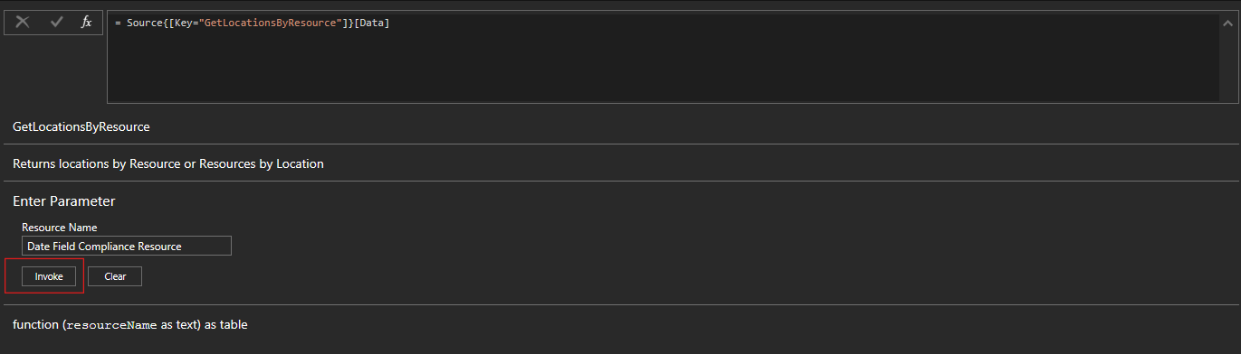 Note:You can fill out the function parameters and click _Invoke _to create the table automatically. See example below.