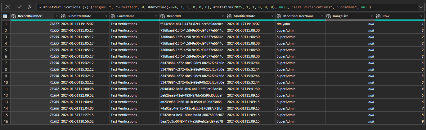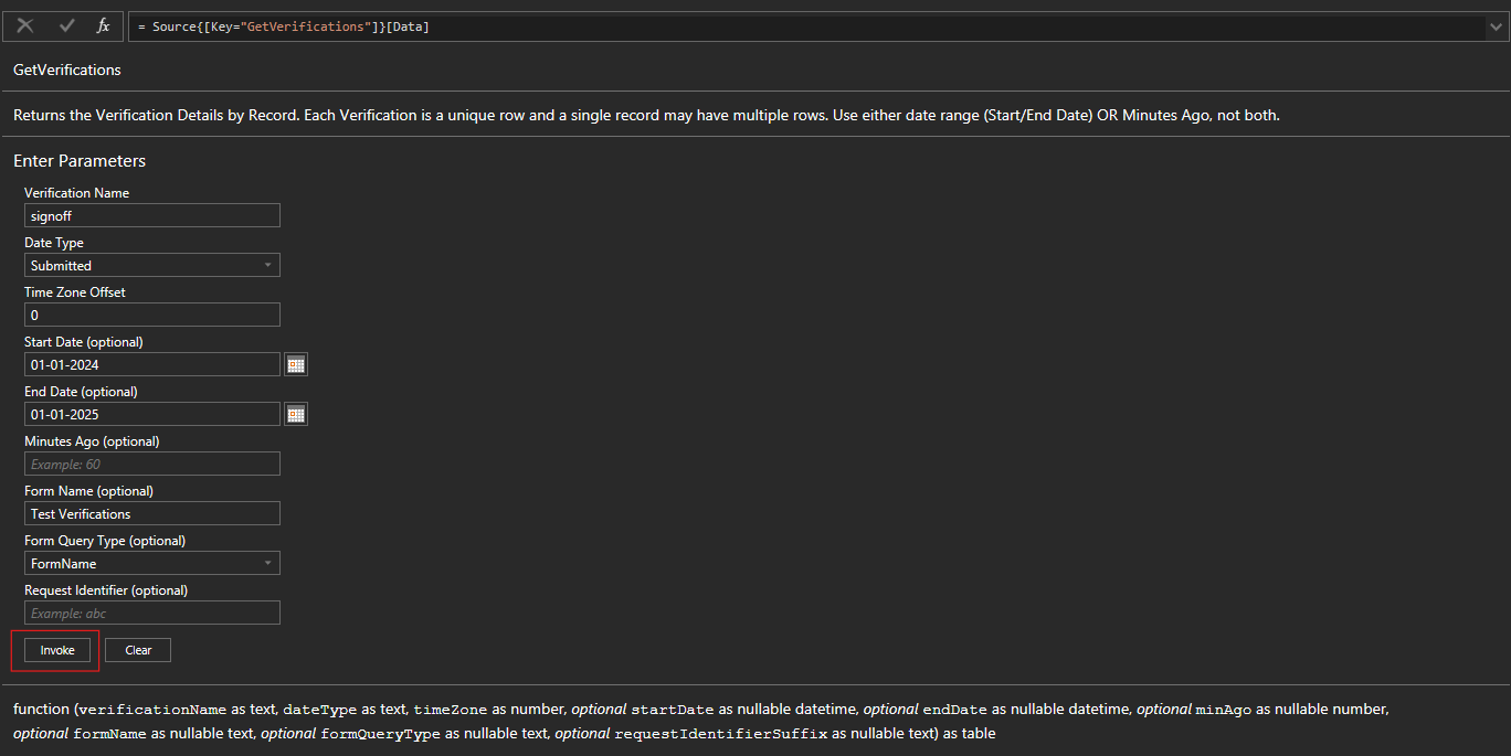 function (VerificationName as text, DateType as text, TimeZone as number, StartDate as datetime, EndDate as datetime, MinAgo as number, FormName as text, formQueryType as text, RequestIdentifier as text)Invoking the Function