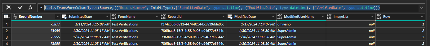 For example, you may choose to set VerifiedDate, ModifiedDate, and SubmittedDate as datetime fields (see the Power Query example below).