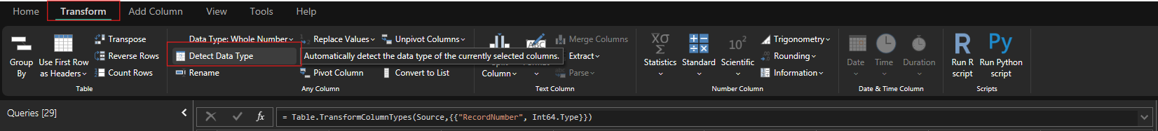 Tip:Once the table is created, you may format the columns as needed. Select Transform-> Detect Data Type.