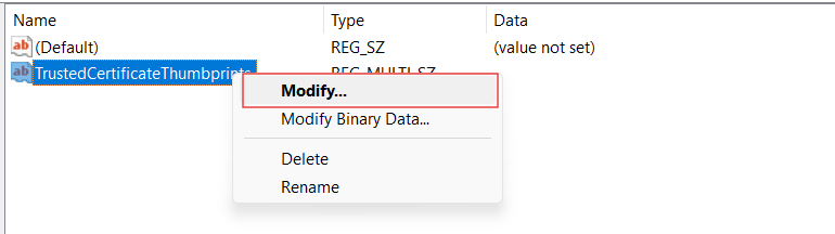 - Right click the TrustedCertificateThumbprints and click Modify... (Or double click)
