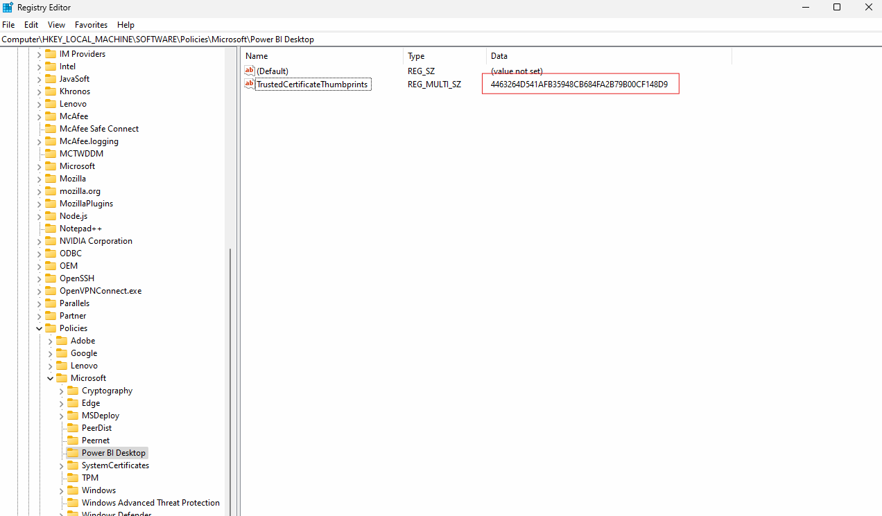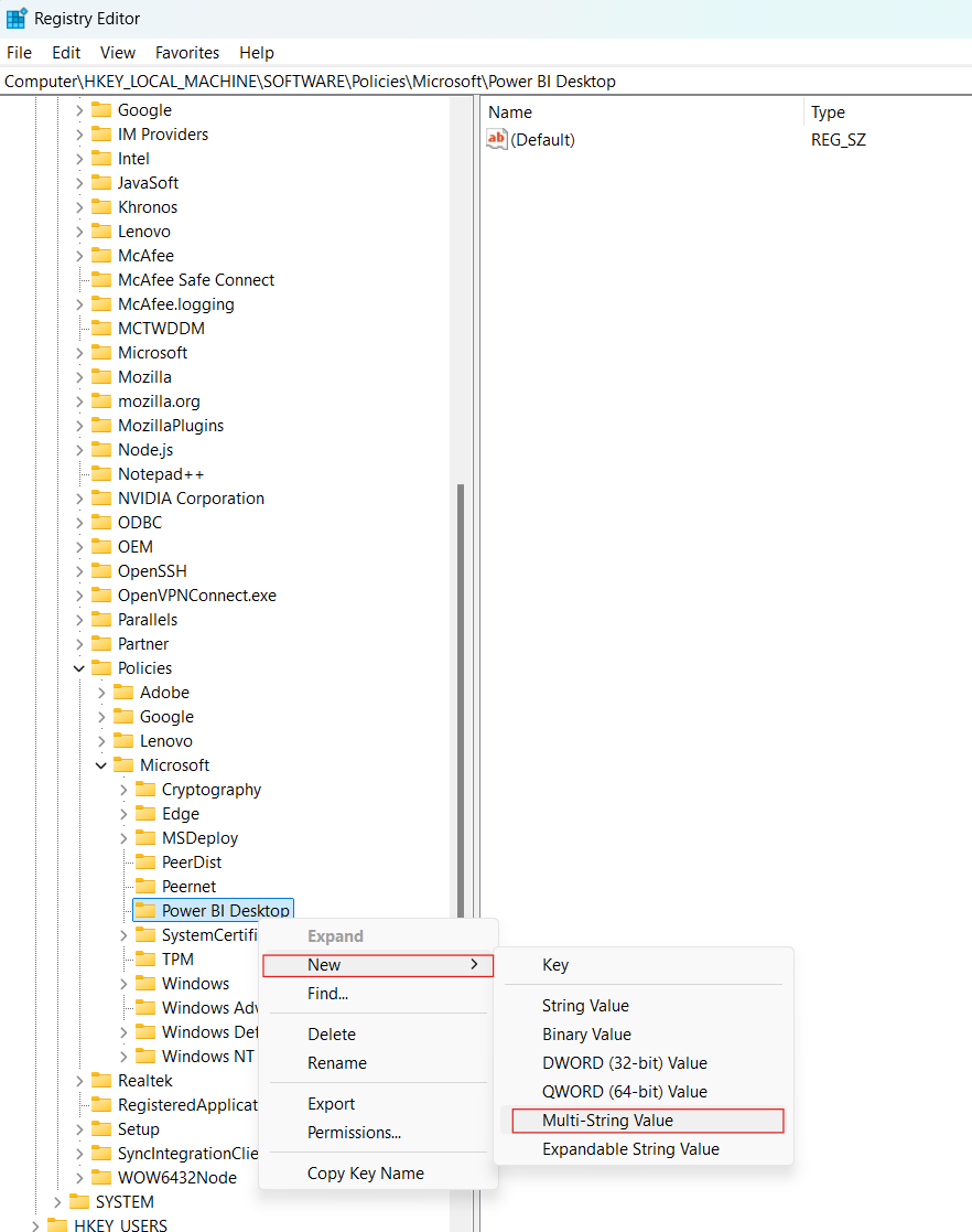 - Navigate to the following directory - HKEY_LOCAL_MACHINE\Software\Policies\Microsoft\Power BI Desktop
