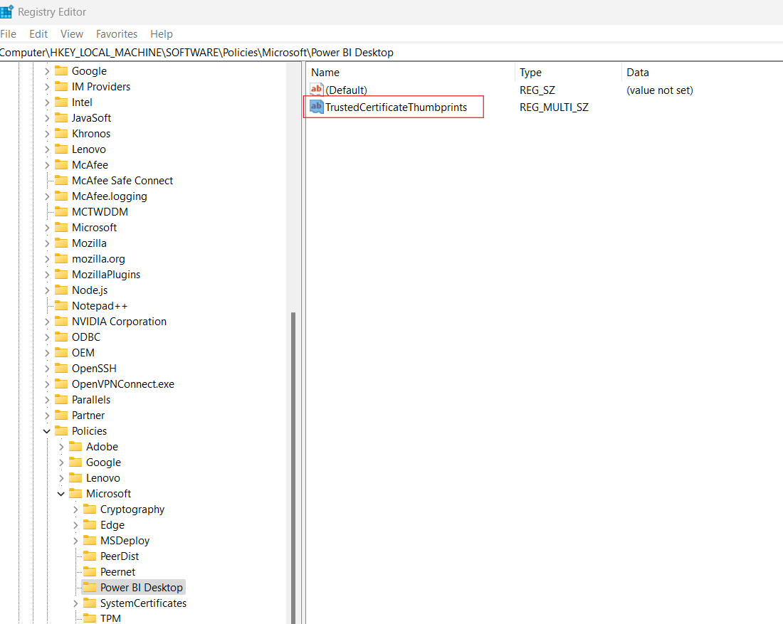 - Next Right Click the Power BI Desktop directory > New > Click Multi-String Value then name the file TrustedCertificateThumbprints