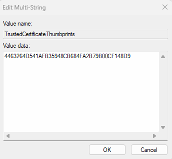 Note:You can add multiple certificates by using \0 as a delimiter, or in the Registry Editor, right-click key, then select Modify to put each thumbprint on a new line.
