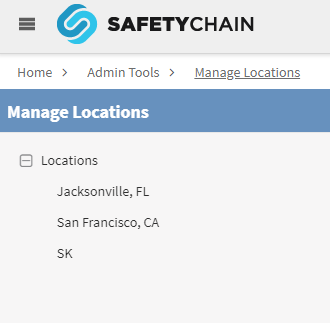 Locations are a layer of all user security filtering within the SafetyChain Software application. An example of how this Location information is structured within the UI.