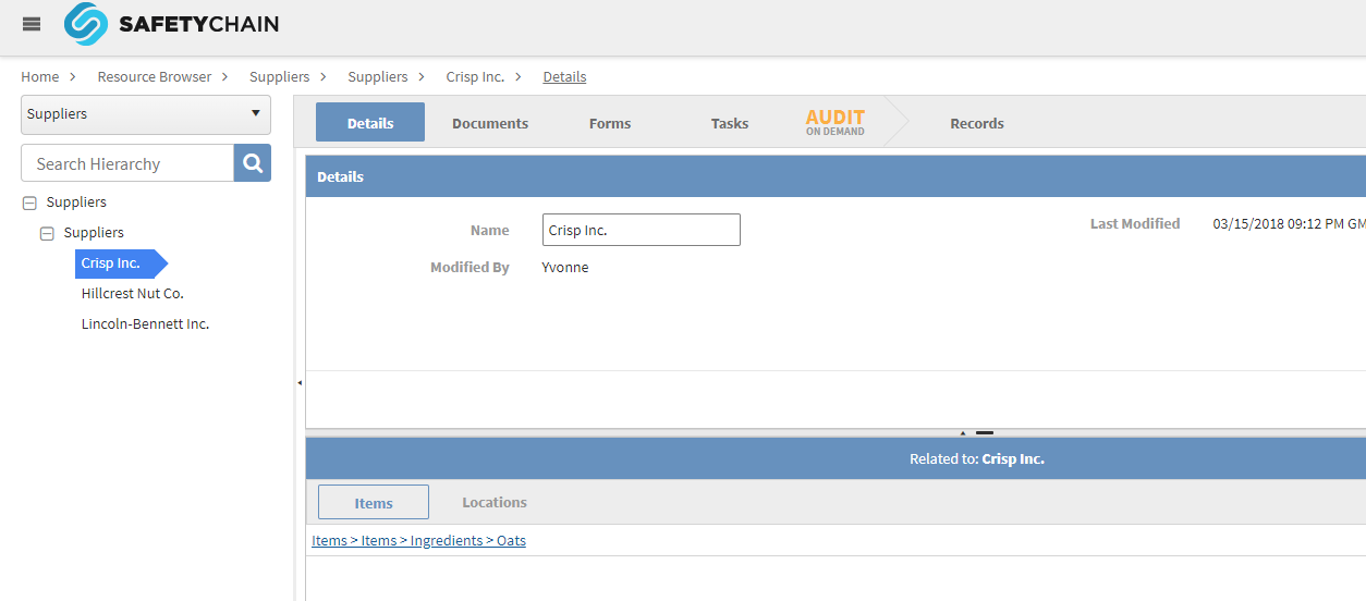 Resources are how business objects (Customers, Equipment, Items, or Suppliers) are collectively referred to within the SafetyChain Software application. These objects are organized within a Resource defined hierarchy within the UI known as the Resource Categories. Below, on the right a basic Supplier Resource within the SafetyChain UI, note the Resource Category hierarchy on the left.